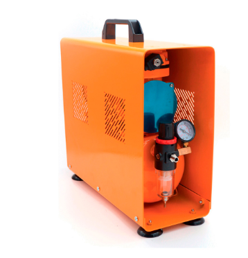 Professional portable compressor to atomise food colouring through one of our airbrushes. The correct functioning is guaranteed by the Teflon piston without lubrication oil, which reduces the necessary maintenance. The working pressure is always constant thanks to the flow regulator, making this airbrush compressor perfect for all airbrushing and food colour spraying jobs.