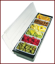 Condiment garnish center is ideal for storing various garnishes like Maraschino cherries, cocktail onions, olives, and lemon slices at your bar as well as condiments like ketchup, mustard, mayo and more.