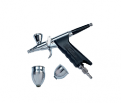 The flow regulator is single-action and the nozzle is 0.3mm. The airbrush comes with three tanks of 2, 5 and 13 cc and is therefore very versatile.